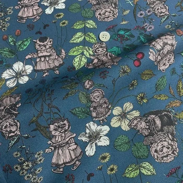 【nora. ノラ】25WI-AM1022-B(3D) 猫柄 植物柄 ブルー シーチング 110cm幅