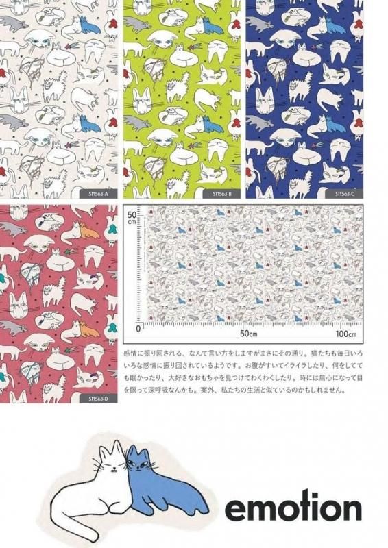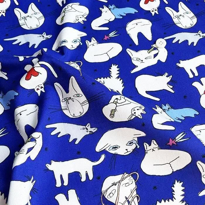 【nora. ノラ】25WI-ST1563-C(3D) ネコ柄 イラスト調 ブルー シーチング 110cm幅