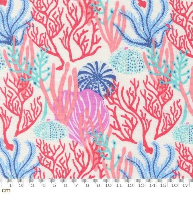 海 砂浜 ビーチ リーフ タイドプール 海のいきもの 魚 貝 ヒトデ ウニの殻 ウミシダ カシパン 海藻 サンゴ シーチング 110cm幅 パッチワーク ハンドメイド